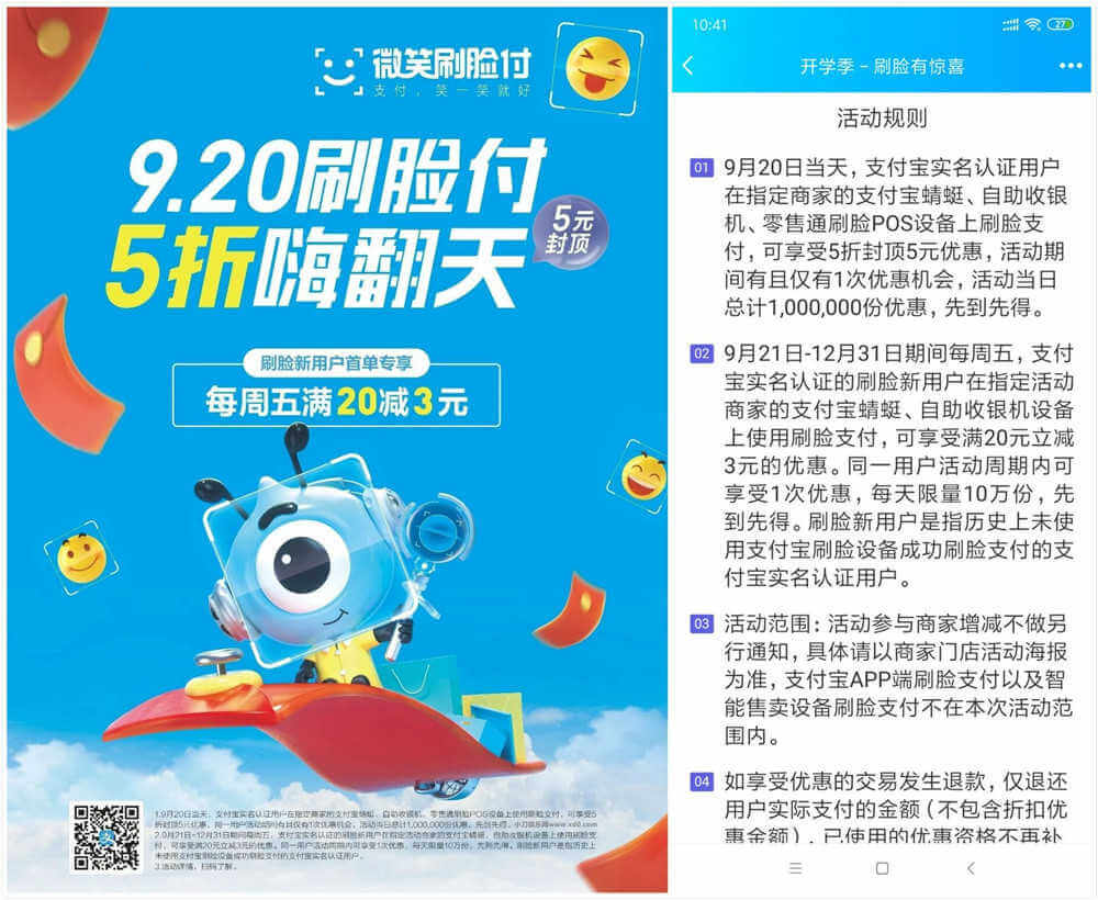 支付宝9.20刷脸活动可享受5折优惠(封顶5元)需在指定设备上活动说明:https://render.alipay.com/p/c/k08m1dx1