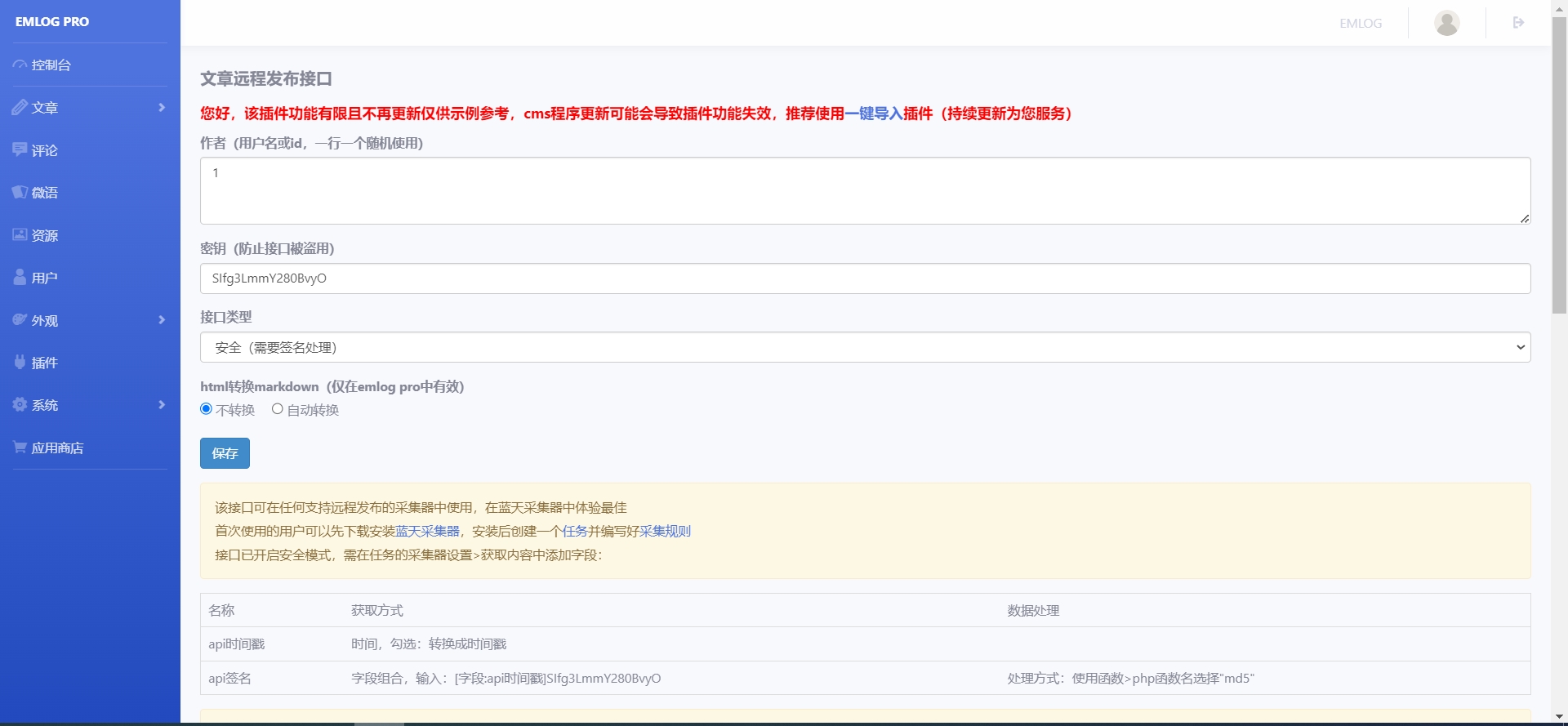 Emlog文章远程免登录发布接口插件:https://zhizun.lanzouu.com/iCE1s2l1kuuf