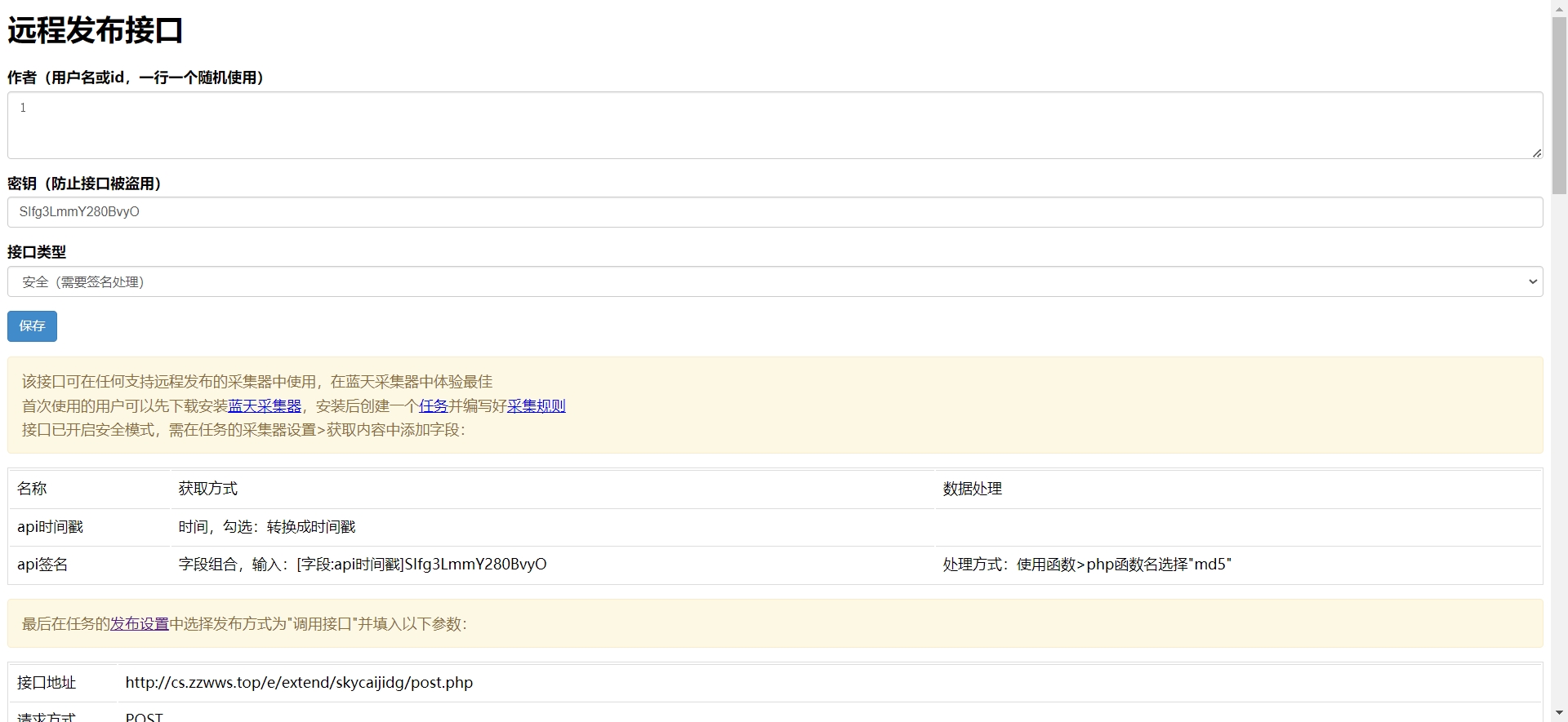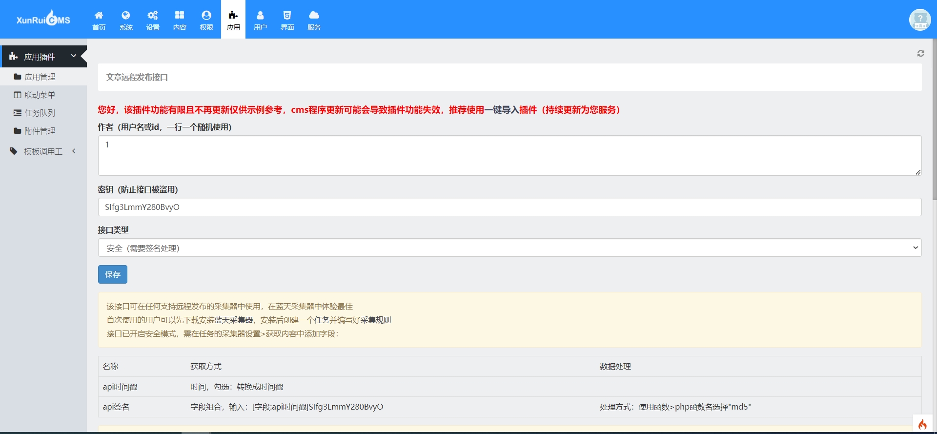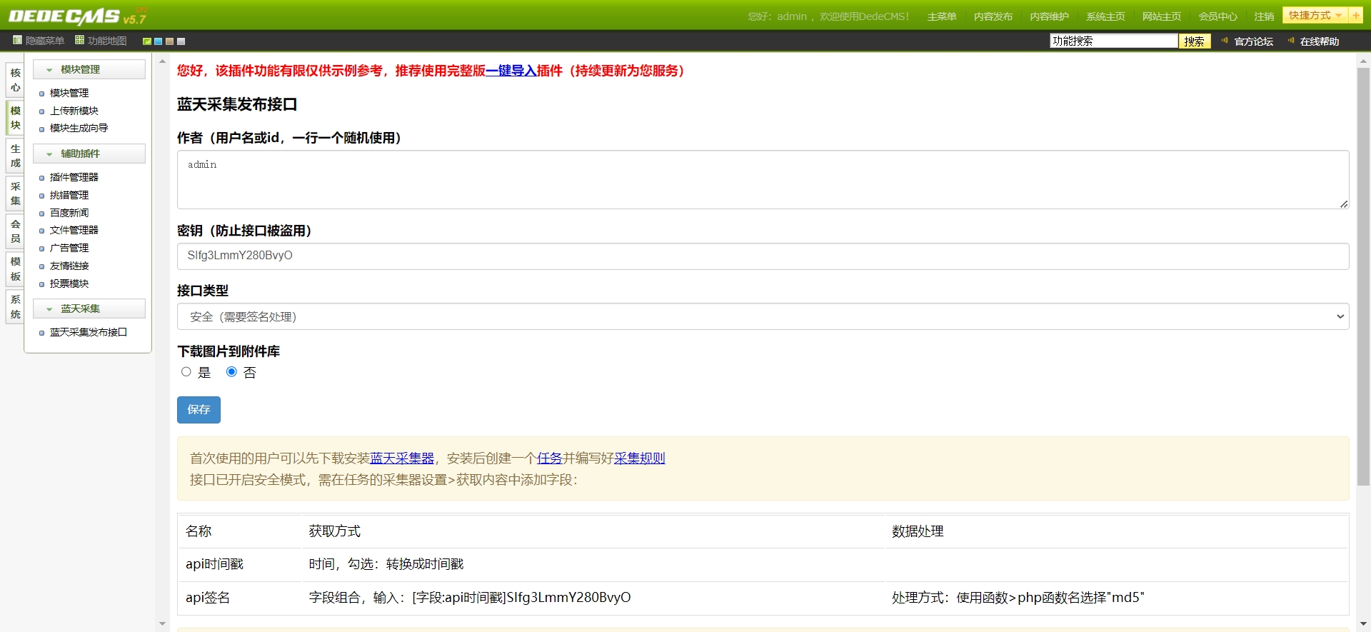 首次使用必须打开网址“帝国cms网址/e/extend/skycaijidg”,之后可在“帝国cms后台»插件»远程发布接口”中使用