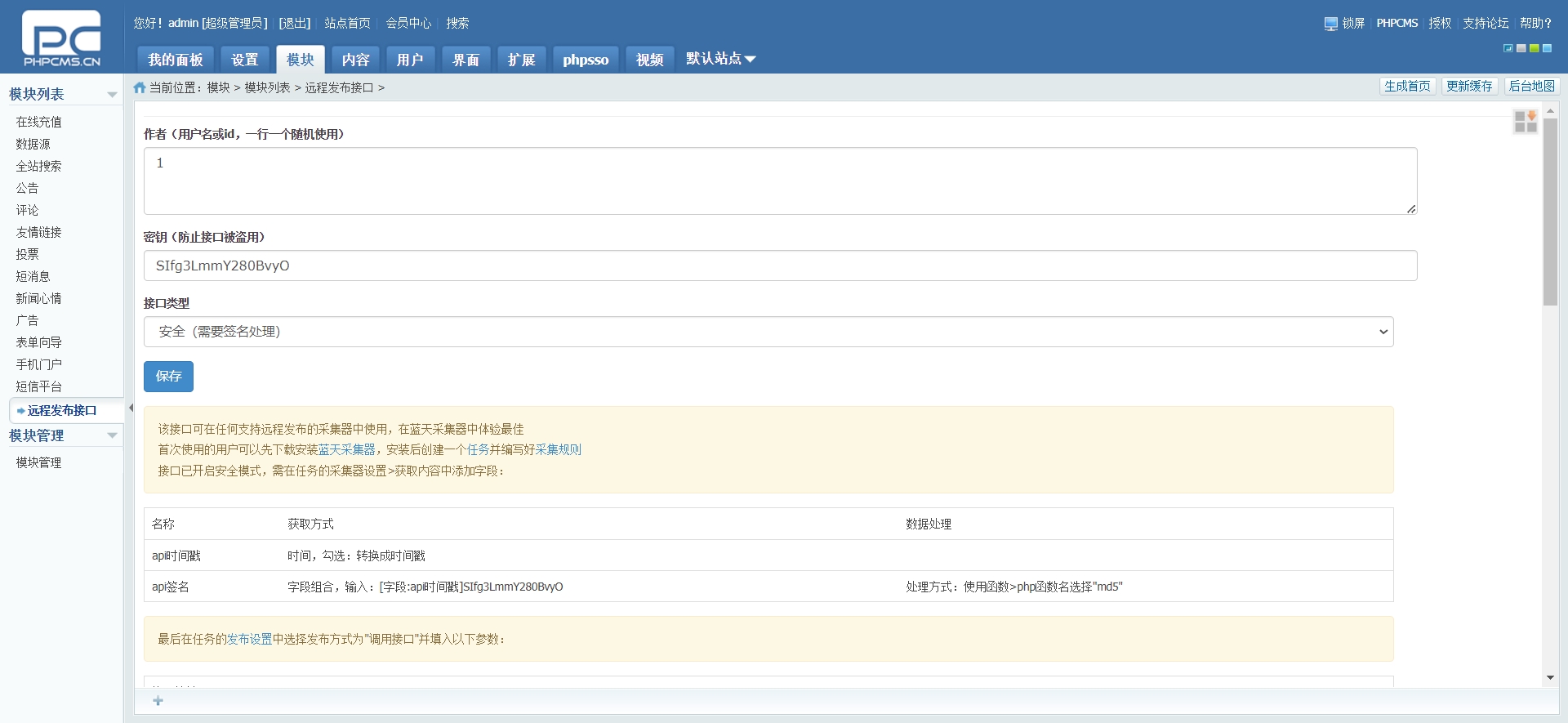 然后在“phpcms后台»模块»模块管理”中安装“远程发布接口”,安装后在模块列表中点击使用