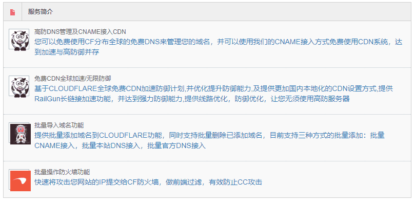 利用Cloudflare Partner提供的API而搭建起来的免费DNS和CDN加速接入平台,注意DNS和CDN皆为Cloudflare官方提供,只不过利用API建立了一个入口,好处有两个:一是不用修改NS而使用CNAME或者A记录等方式就可以接入Cloudflare;二是提供免费的Railgun动态加速。