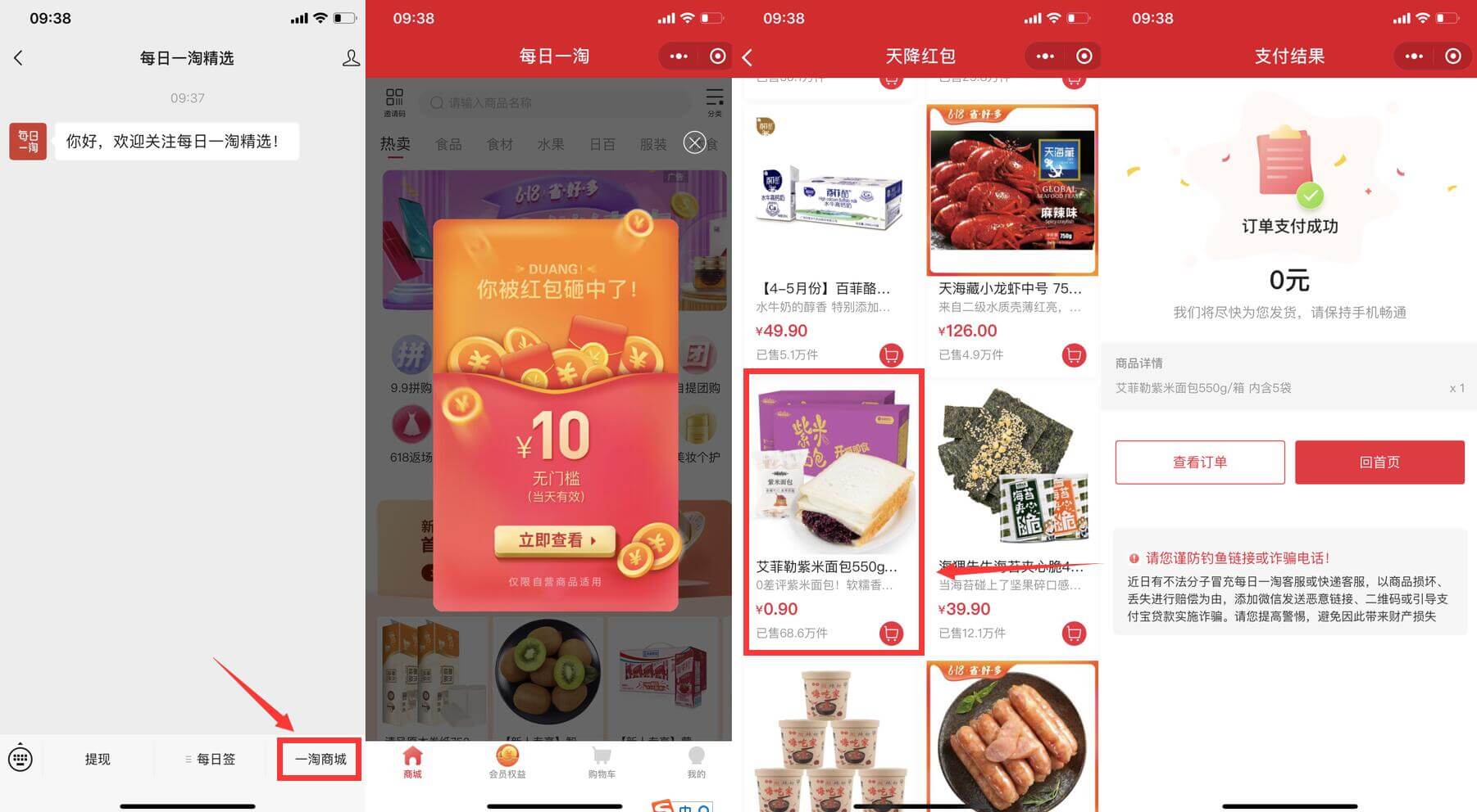 微信关注公众号“每日一淘精选”零撸面包->菜单栏右下角 “一淘商城”进入->领取10元无门槛券后 下拉商品 找到0.9元的紫米面包->点击后 单独购买 不要开团->填写地址后等发货就行!