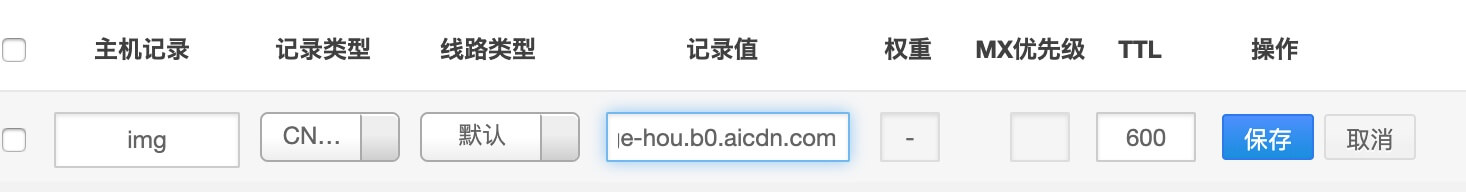 在自己域名的解析商处,添加CNAME记录,记录值为img,记录类型为CNAME,记录值为上图红圈的位置。