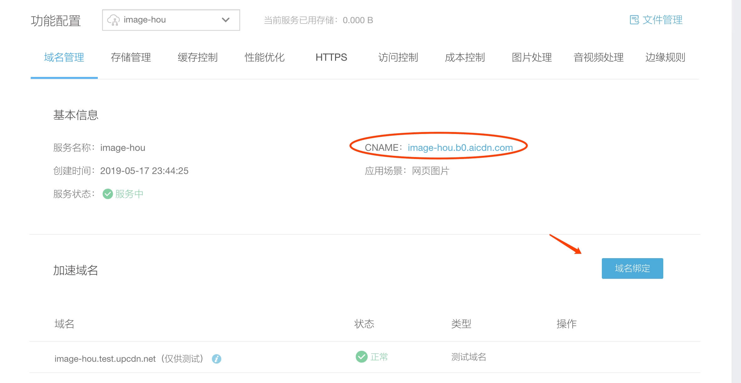开通成功后,在配置页面点击域名绑定。然后输入自己的域名/子域名,例如img.域名.com。