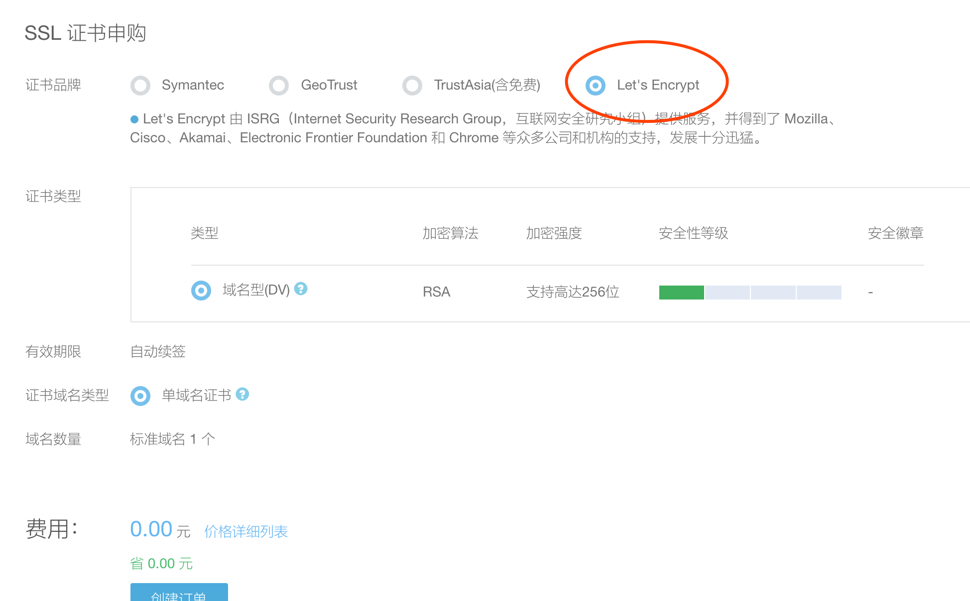 点击申购证书进入购买页面,在证书购买页面,建议选择免费的Let's Encrypt即可,又拍云会自动续签、长期有效。购买证书后,需补填域名。