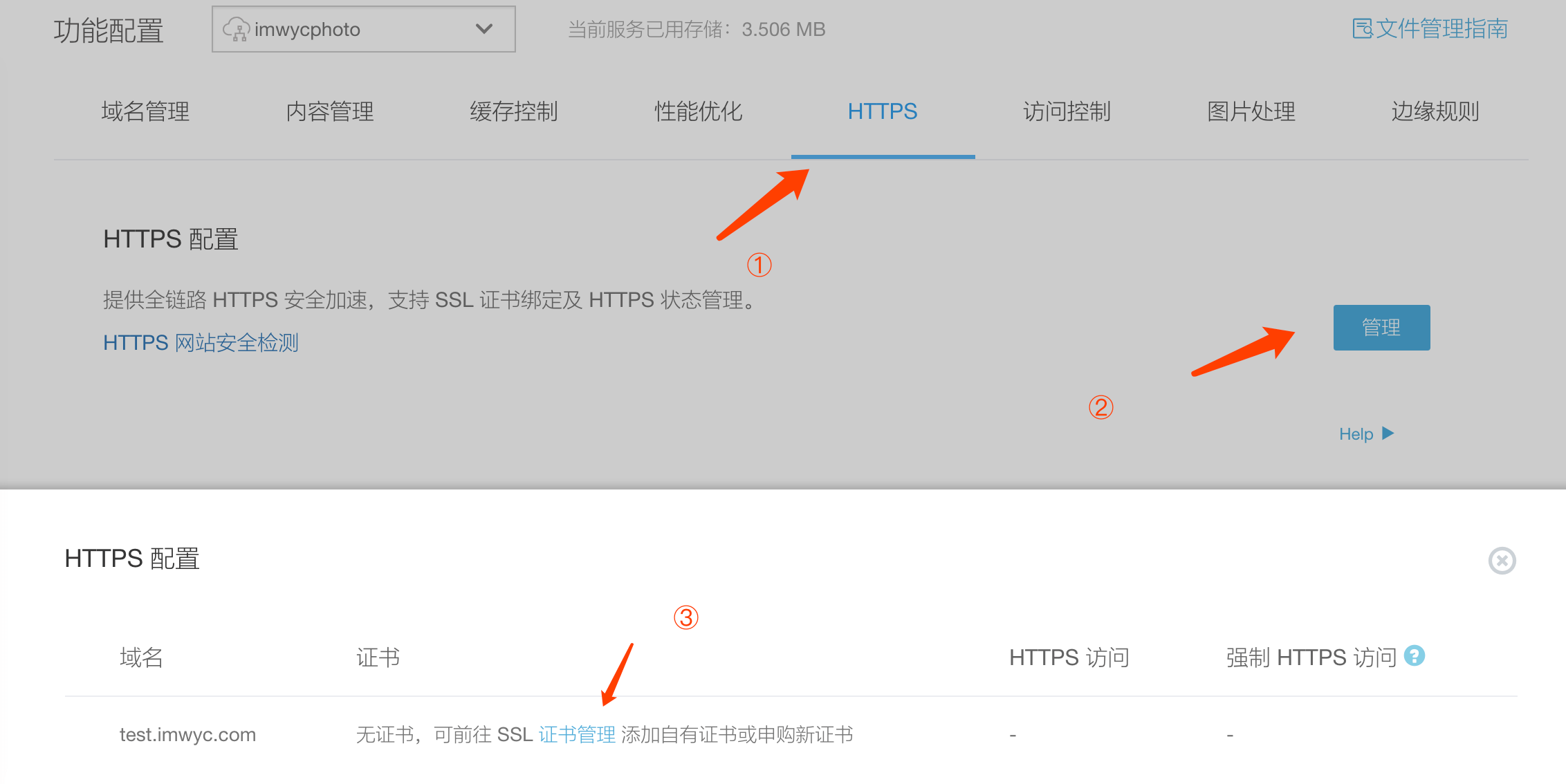 下面,为自定义域名开启https(可选)。如下图所示,依次点击进入证书管理。