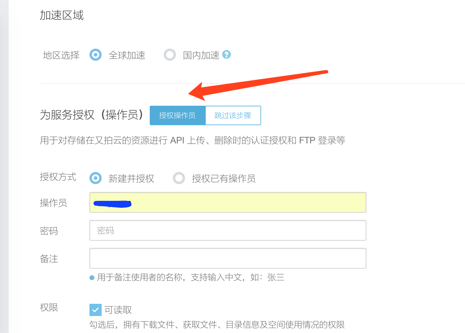 点击右上角的创建服务后,设置云存储名称,并绑定操作员并授予权限,记下操作员密码。可以看到,又拍云的云存储是自带CDN加速的。