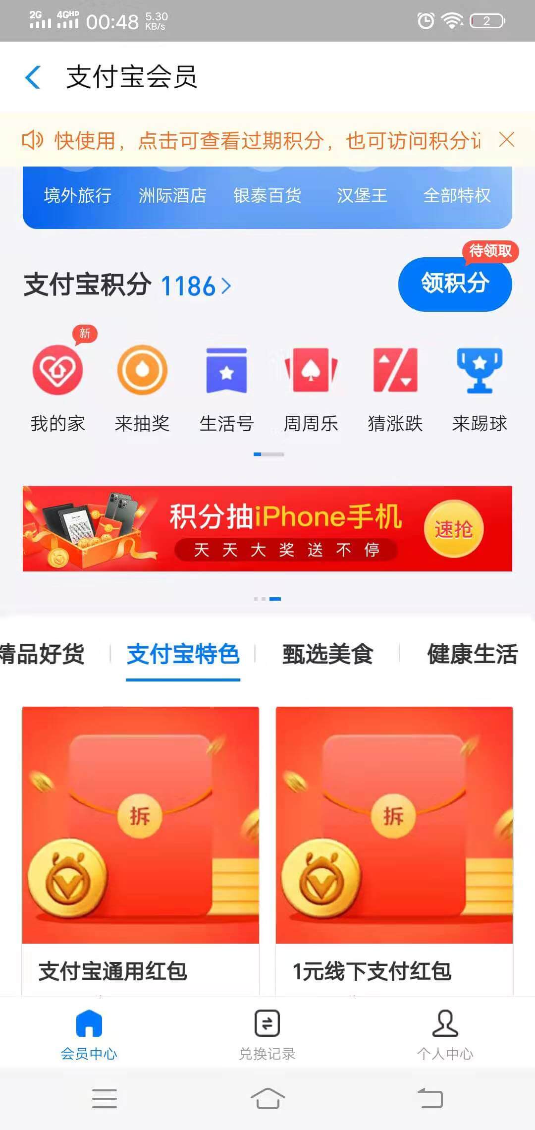 现支付宝的铂金会员和砖石会员,在每天15点可使用14950积分兑换50元线下支付券包,券包包含5张线下10.01-10的支付券。积分多的并且会员等级够得要留意兑换哦,年底了花一花吧~兑换路径:打开支付宝APP-我的-支付宝会员,下面选择支付宝特色