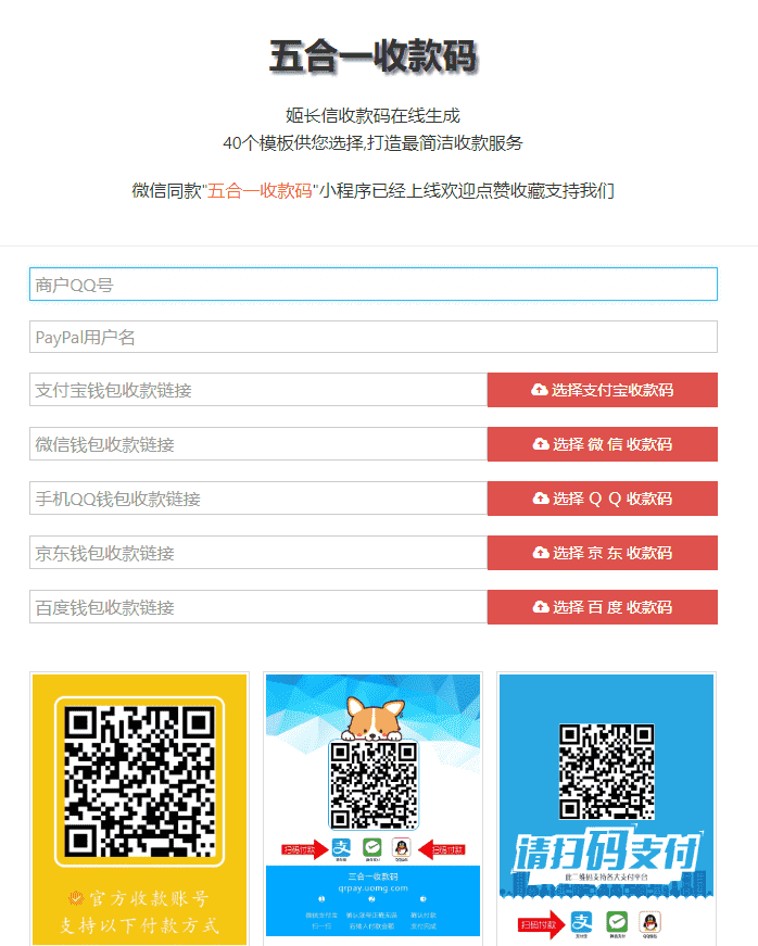五合一收款码在线生成,40个模板 支持微信支付、支付宝支付、手机QQ支付、京东钱包、百度钱包,PayPal五合一收款,将其二维码合并为一个二维码,无需手续费,支持qq头像,昵称判断(HTML单页版多模板免安装)