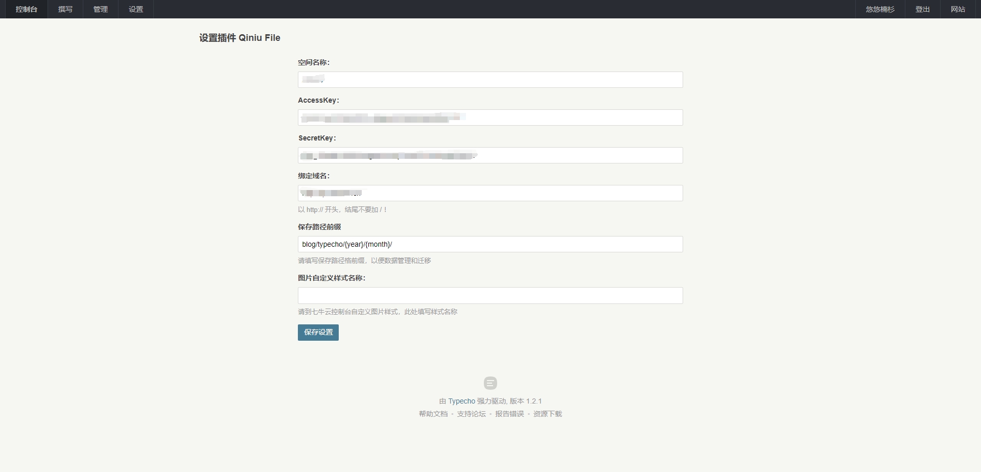 登录博客后台在控制台->插件页面处将新上传的插件激活,激活成功后点击插件设置按钮,按要求填写七牛服务的配置项。