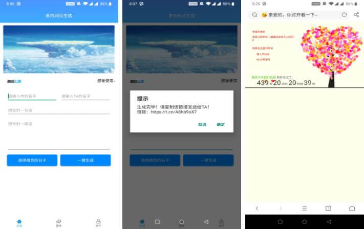 已破解去除了引流广告,干净体验这不是情人节到了吗?最近疫情严重也不好表白,做个网页给喜欢的女孩子输入名字和相恋的日子直接生成发给女朋友肯定会感动的哈哈!下载地址:https://www.lanzouy.com/i9csz4d