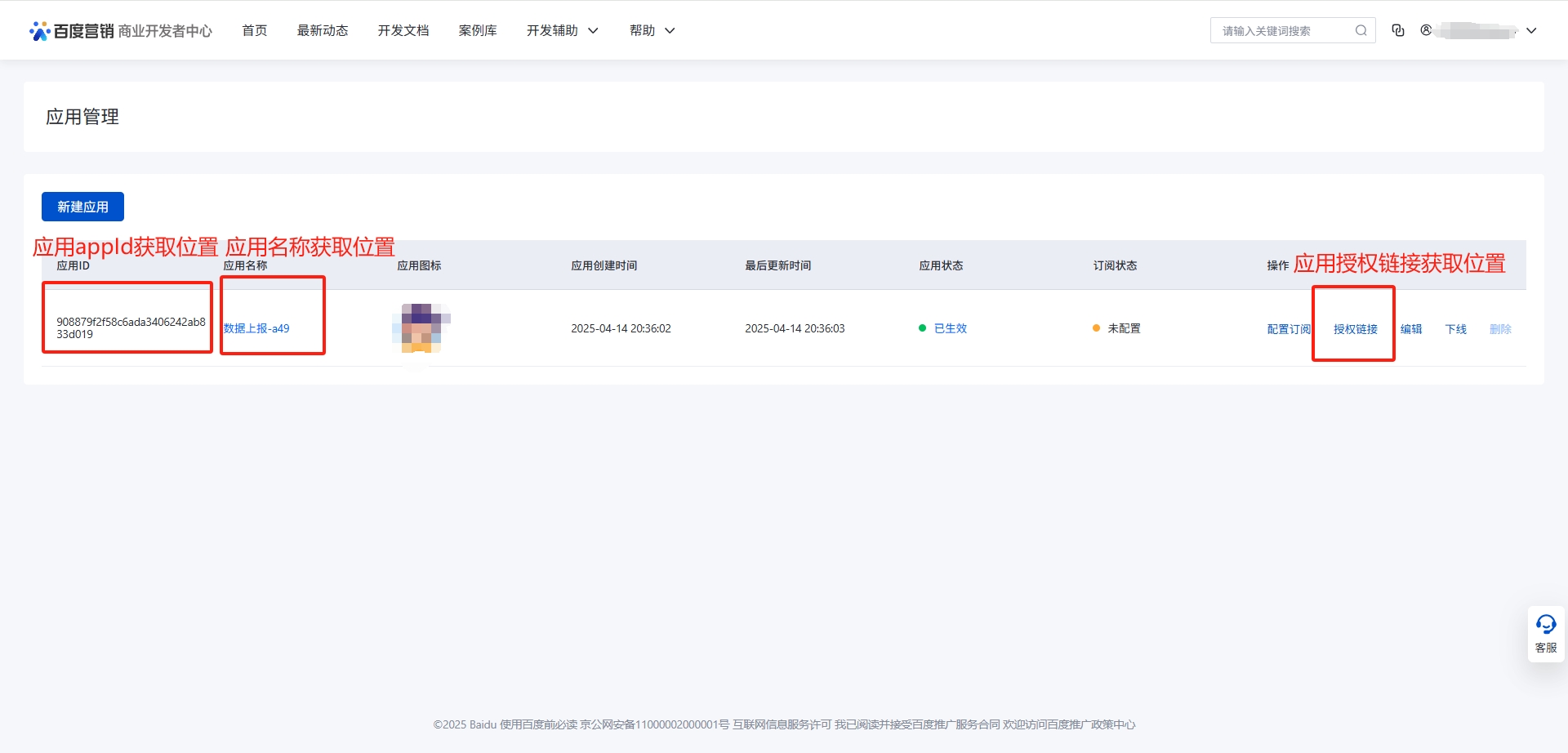 应用appid,应用名称,授权链接获取位置: