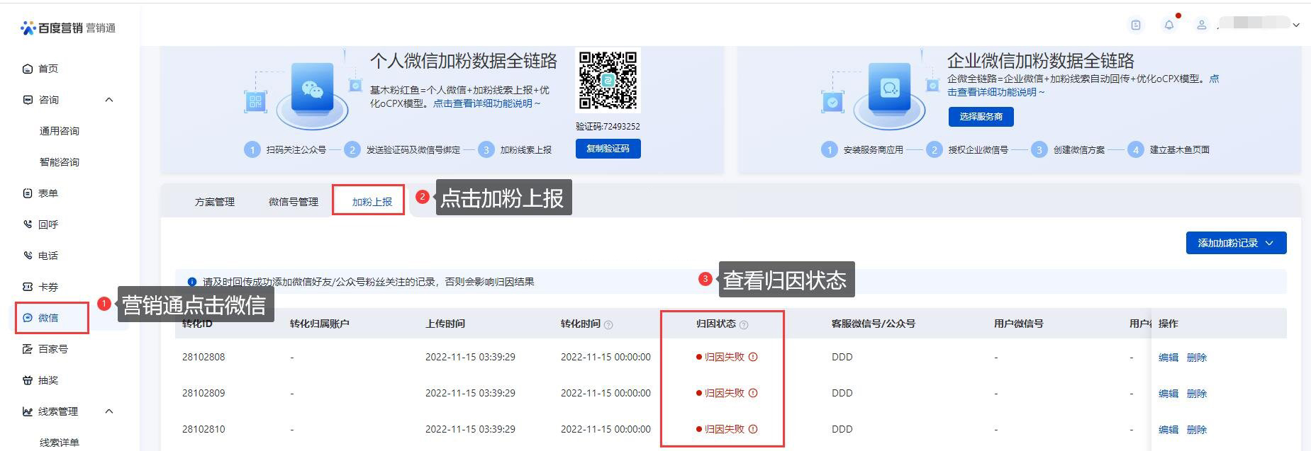 选择推广账号和到粉微信后上报