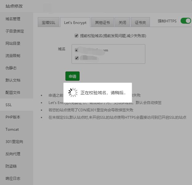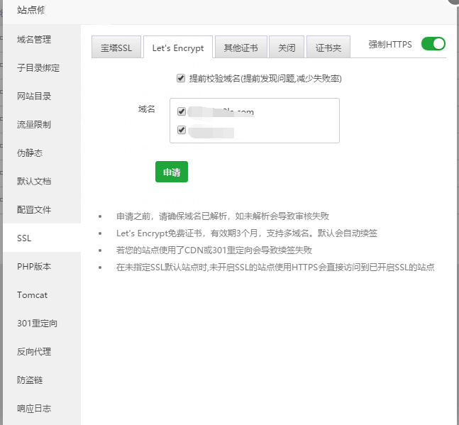 Let's Encrypt免费证书,有效期3个月,支持多域名。默认会自动续签。若您的站点使用了CDN或301重定向会导致续签失败。
