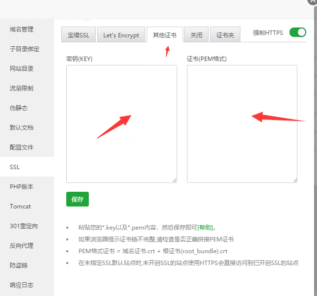 如果你是从别的运营商处购买的SSL证书,比如在阿里购买的证书,腾讯购买的SLL证书等,可以具体下图所示,把你所有获取到的证书和密钥分别填写,然后保存即可