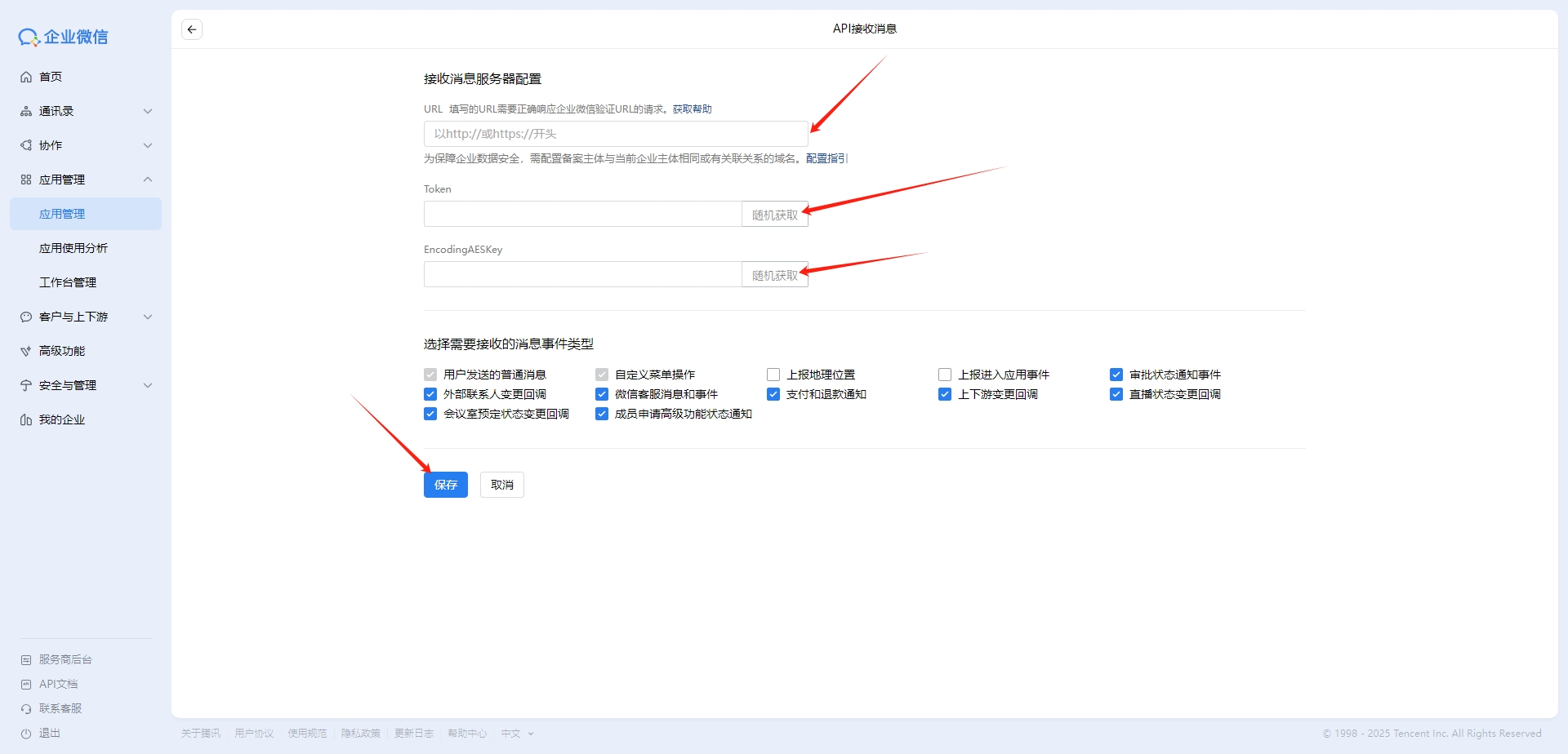 5、URL是填写支付后的回调URL,再点击随机生成复制到支付后台,这个是要填写到配置管理->企业微信->Token/EncodingAESKey