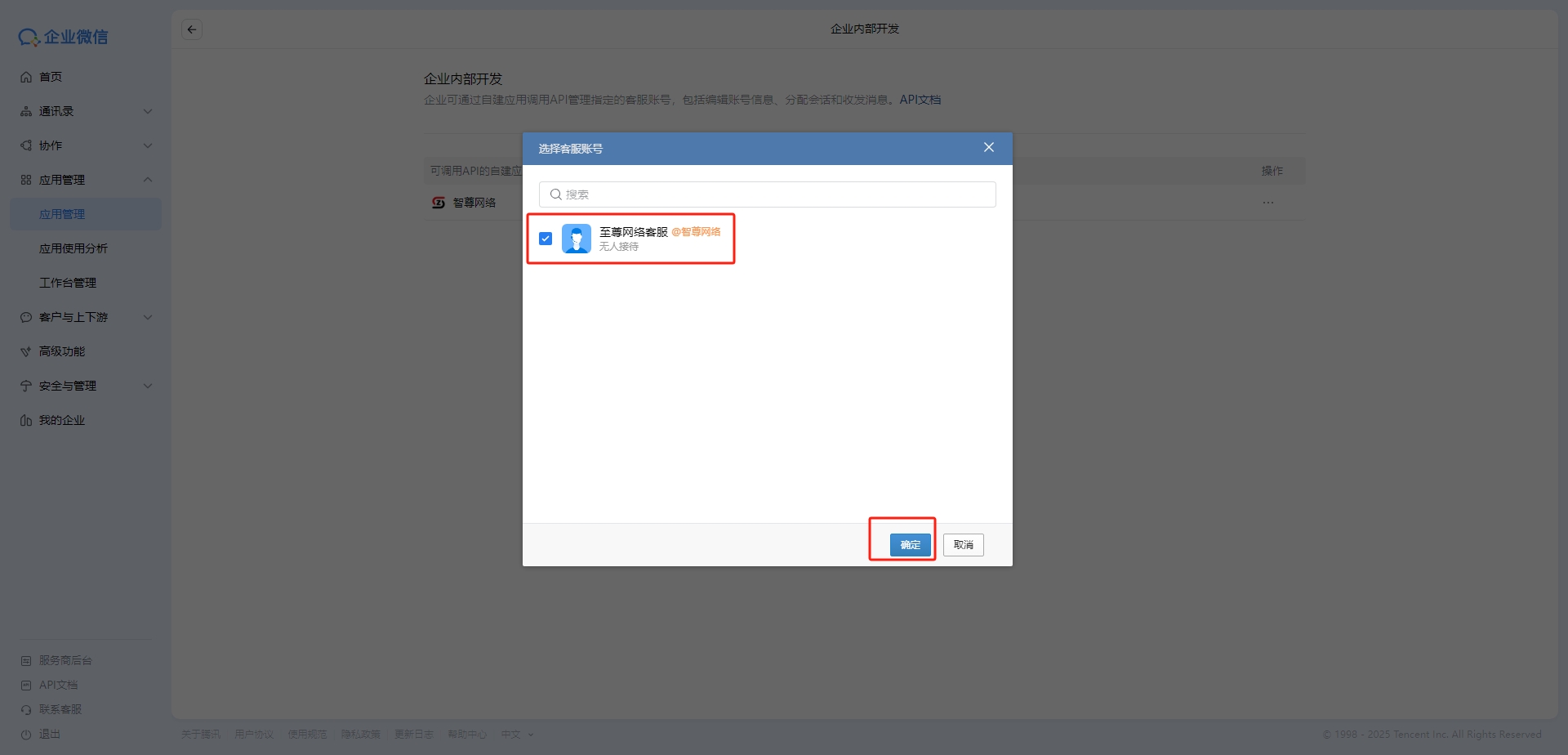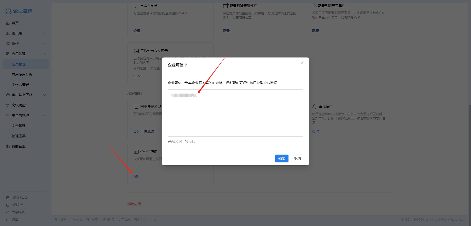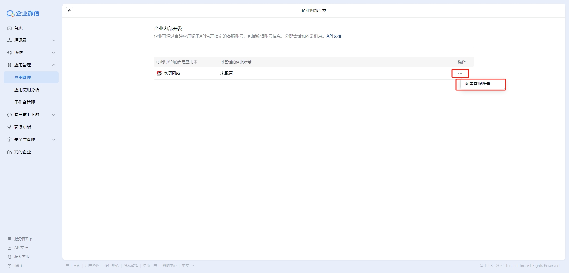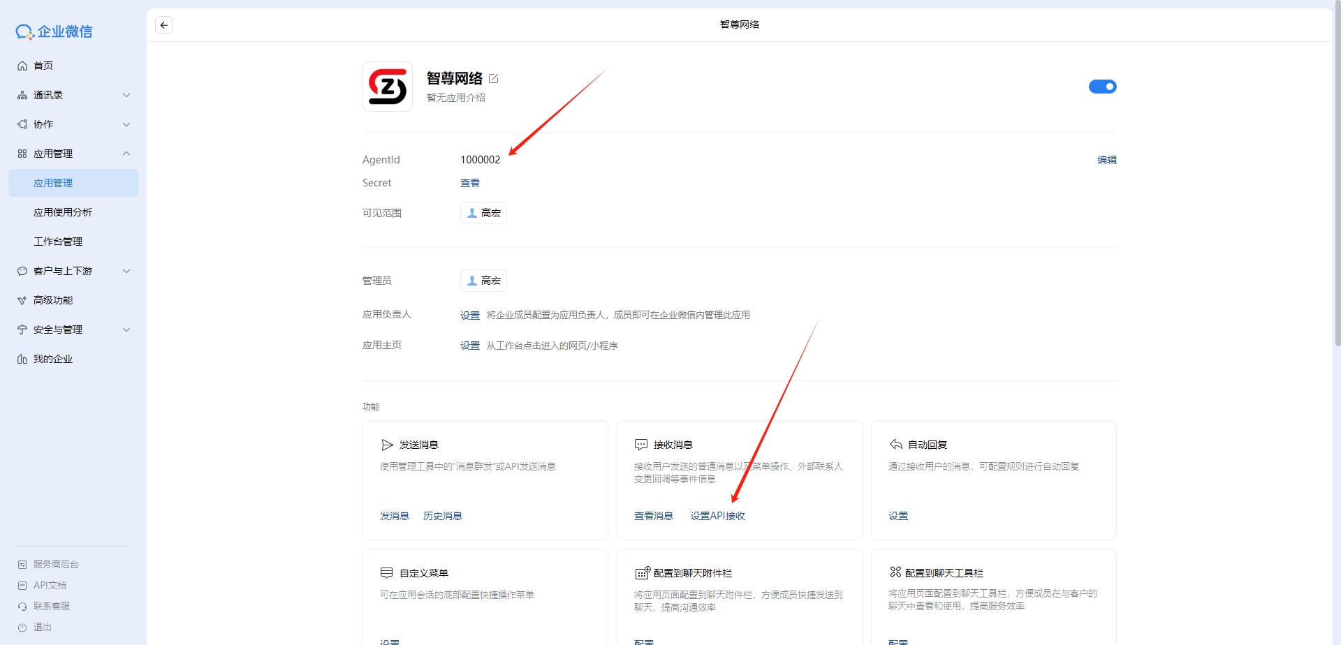 4、再回到刚创建的应用,复制AgentId,然后设置API接收,这个是要填写到配置管理->企业微信->应用ID