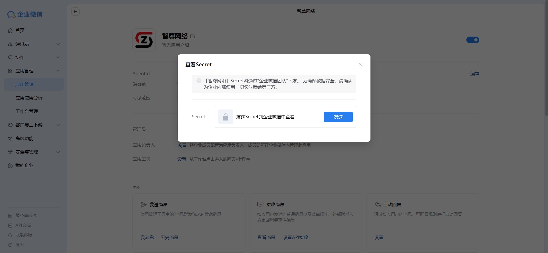 2、点击查看Secret,再点击发送会在企业微信APP里收到Secret,这个是要填写到配置管理->企业微信->应用Secret