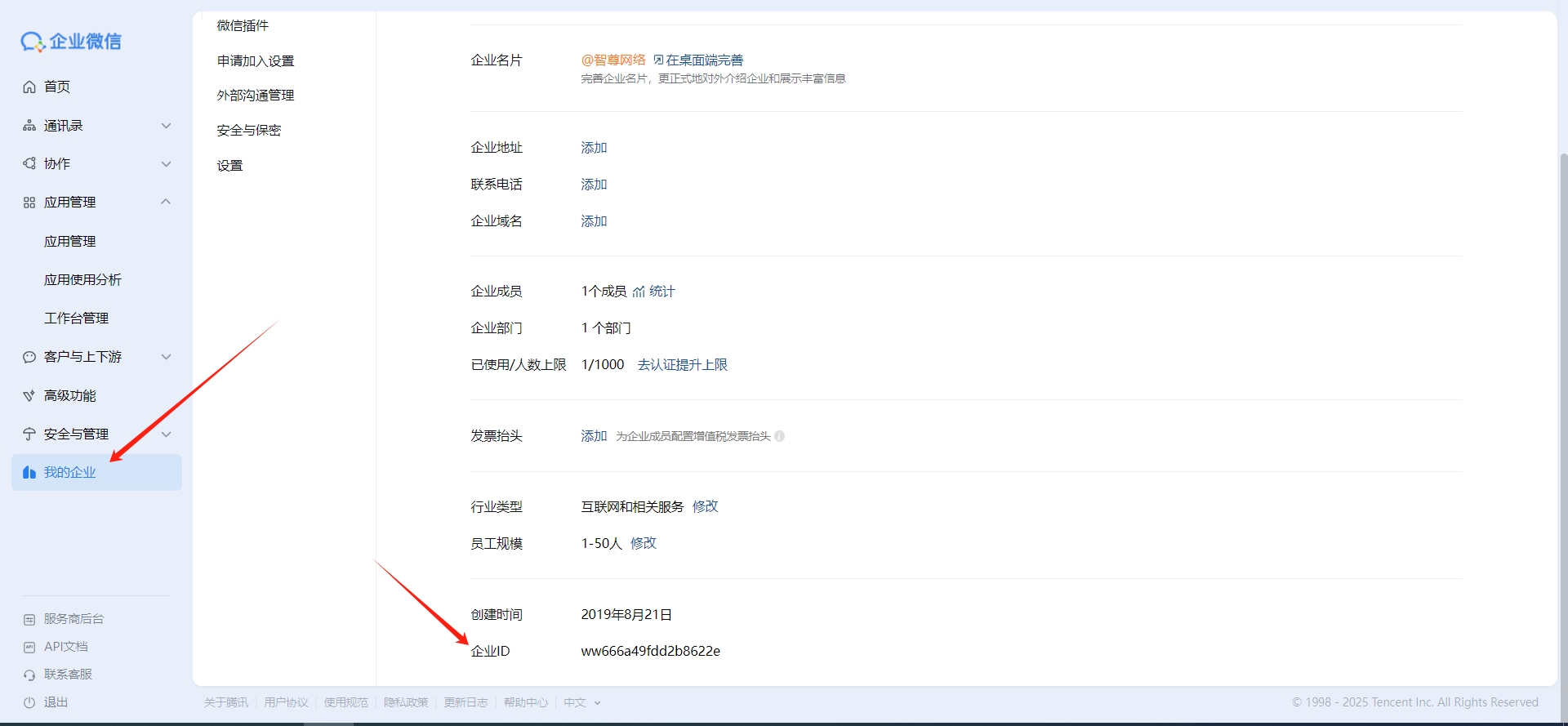 3、左边的菜单栏点击我的企业,复制企业ID,这个是要填写到配置管理->企业微信->企业ID