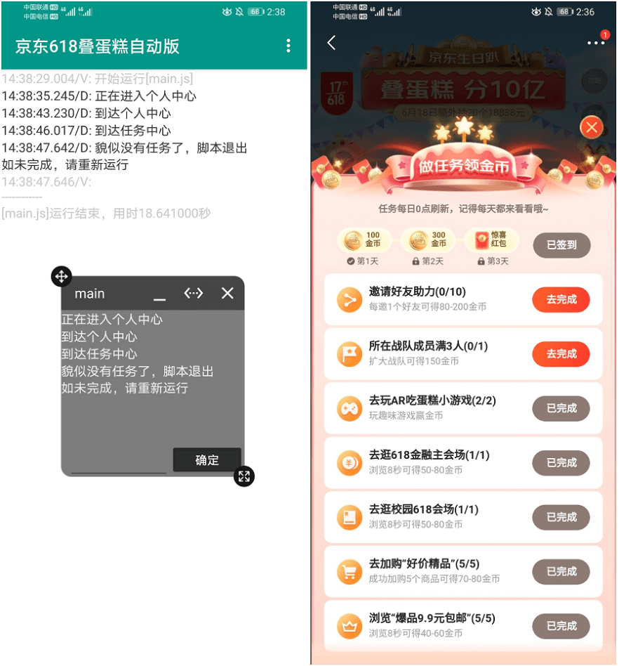 相应的无障碍和悬浮窗权限限,再打开京东,打开叠蛋糕界面,脚本则会自动运行!