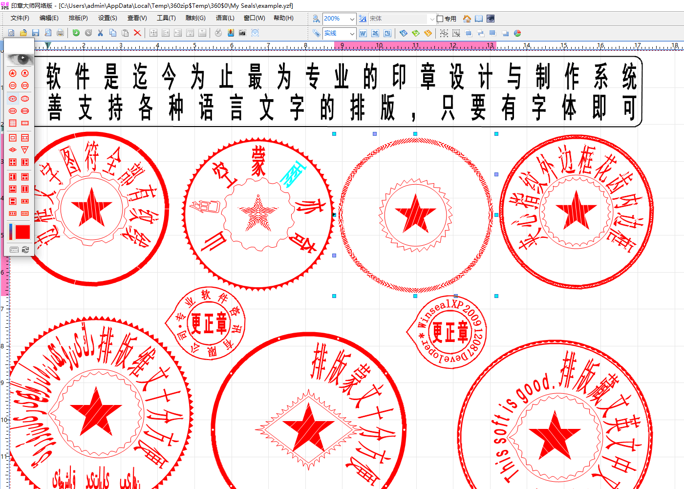 可以将多个不同效果的印章组合成复杂印章,支持各种打印机输出。
