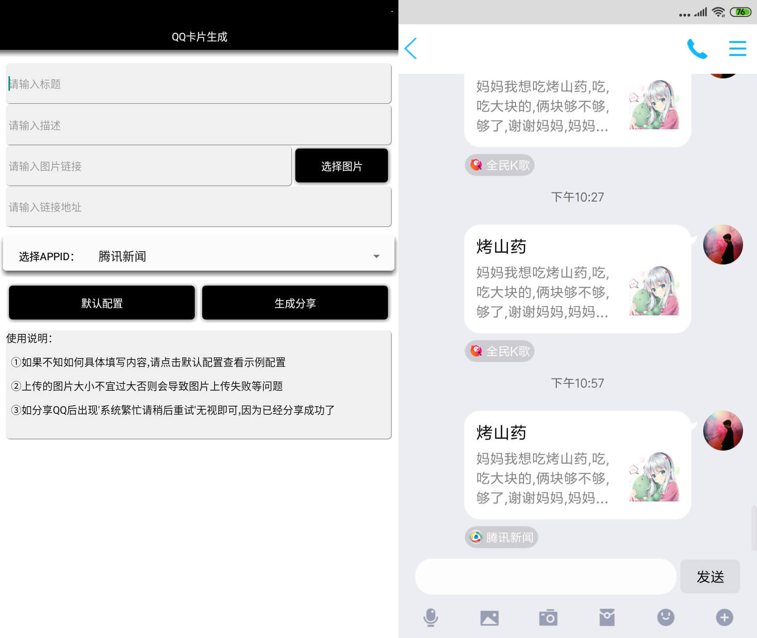 只需简单几步即可一键自动生成恶搞装X卡片消息,做好友中最靓的仔。
