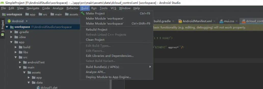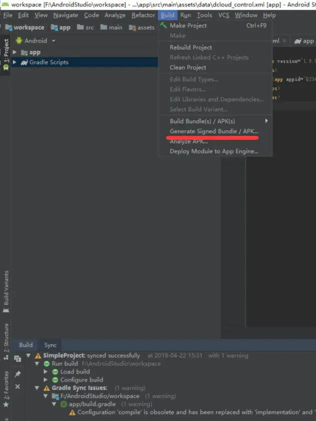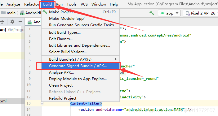 1.点击build栏目-并没有Generate signed apk选项