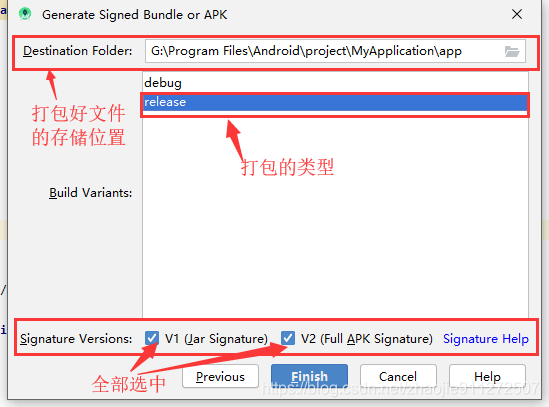 处于安全考虑,V1和V2全部选中,V1来自JDK,,V2是从安卓7.0以后引进的,这种签名提供更加安全的签名方式,使用后,签名后的文件是不能更改的,即安全性会更高。如果只勾选V1则在安卓7.0以上的机器将不能使用更加安全的签名方式,如果只选中V2则在安卓7.0以下的机器中,如果你安装完一个app,那么将会显示还没有安装。为了适用于所有机型,两个都选中。点击finish。