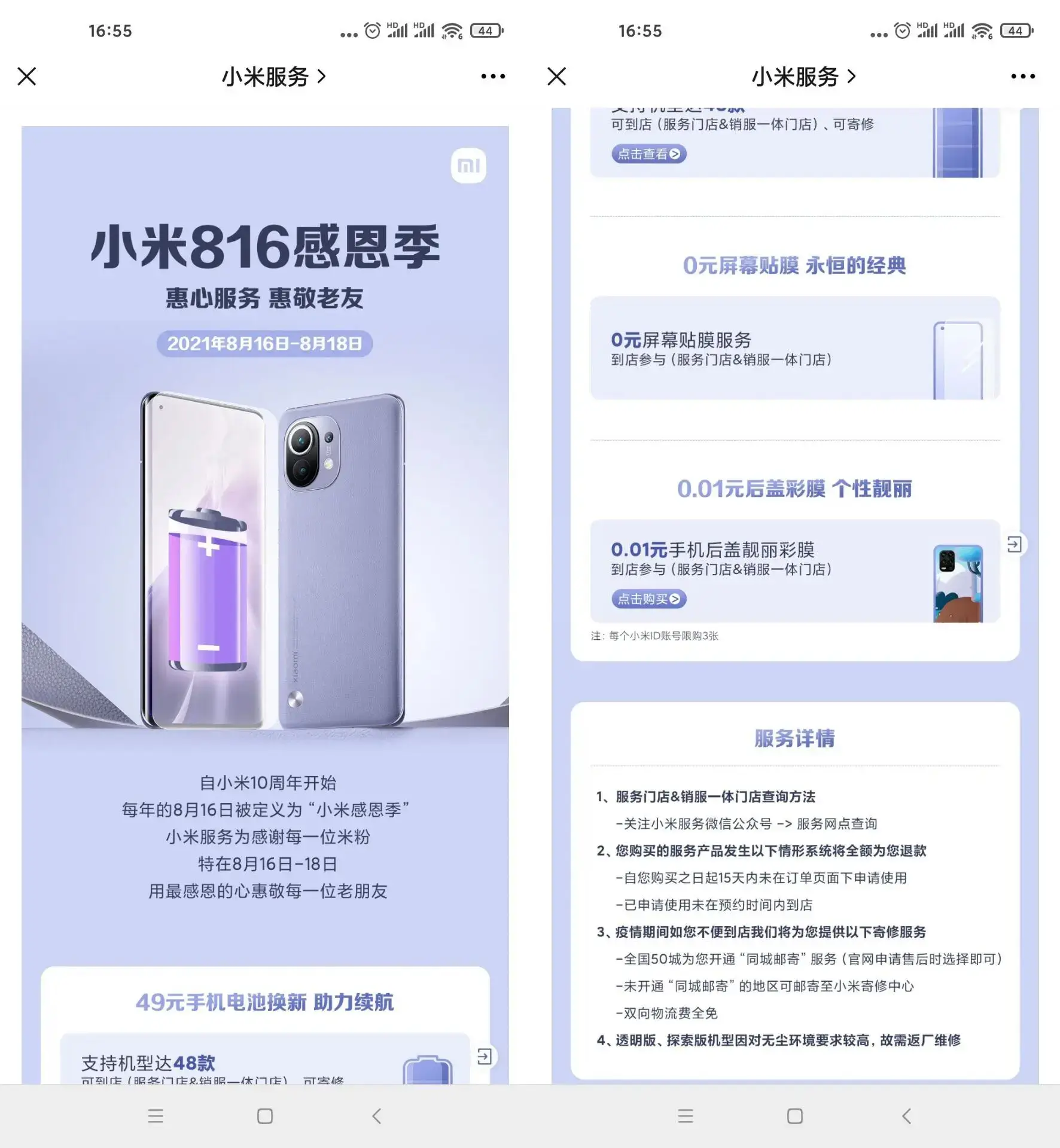 8月16日至8月18日到线下小米服务网点即可享受0元贴幕