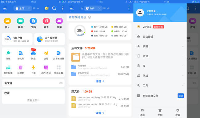 类似Windows的平易UI,多视图和排序,简单易用;同时功能强大,高度可定制,多选、搜索、剪贴板的功能提供给资深用户使用;网络和本地的统一的操作和UI,简单的复制和粘帖代替了文件上传、下载等专业概念;丰富的系统管理功能,包括内存、进程、SD卡、计算机、网盘、局域网、OTG设备等。