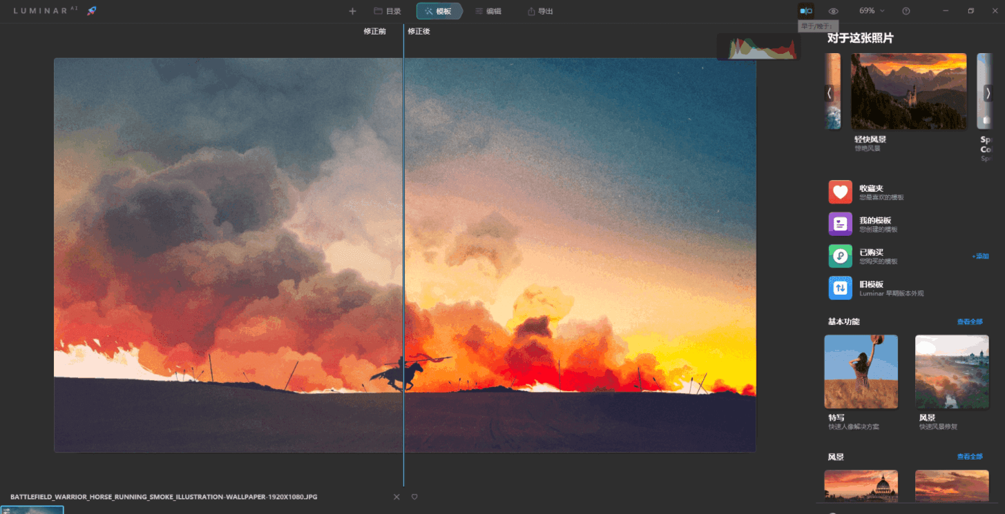 Luminar AI,是一款傻瓜式的图像处理软件,效果类似于Photoshop安装各种第三方扩展后的一键修图。包括智能识别场景、智能编辑面板,一键抠图替换天空、智能人像处理(一键提亮脸部、一键瘦脸瘦身、消除红眼、去除黑眼圈)等,软件内置若干模板可以直接套用,还可以通过购买或者下载自行添加更多模板方便批量处理图片。跟其同门师兄弟Luminar 4相比特点和精髓就在于AI(傻瓜)智能一键修图,与同类型修图软件相比个人感觉是效率和修图质量平衡的较好的一款,特别适合PS小白或者专业摄影师批量简单处理图片使用。