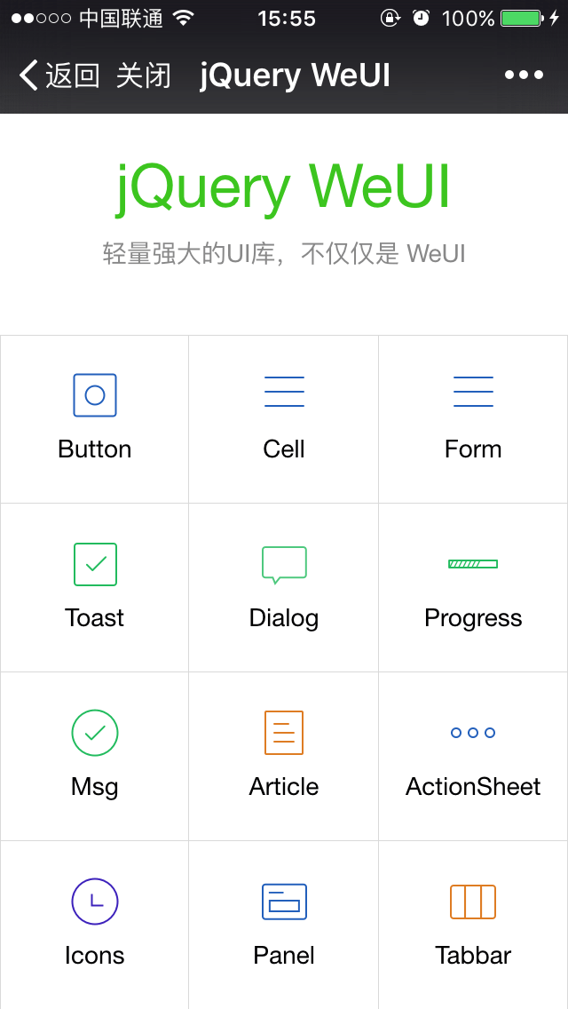jQuery WeUI 提供了总共近30 个非常实用的组件:列表,表单,卡片,对话框,下拉刷新等。