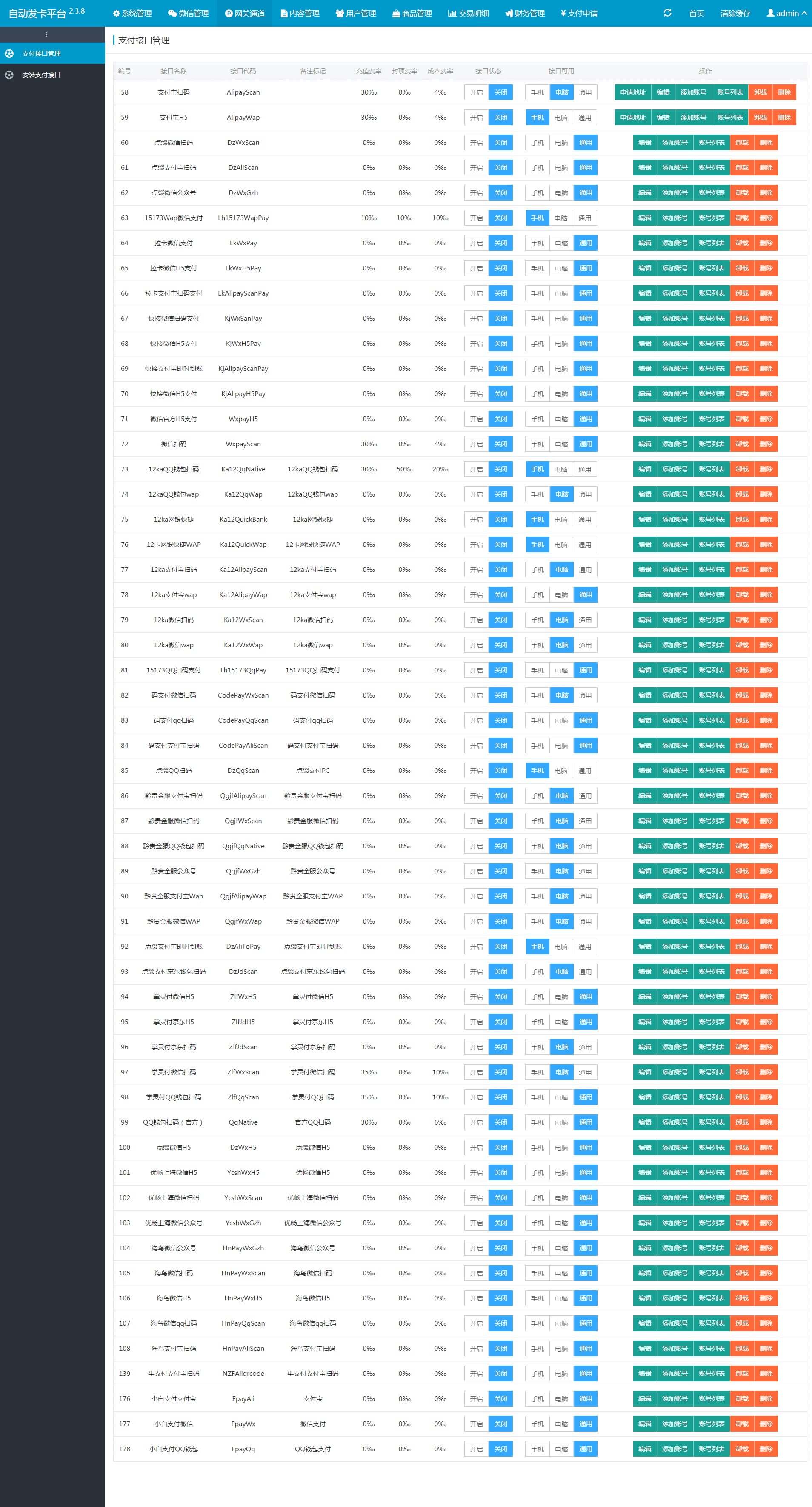 支付配置的话是在网关通道里,里面有很多支付接口,很多免签约的都有