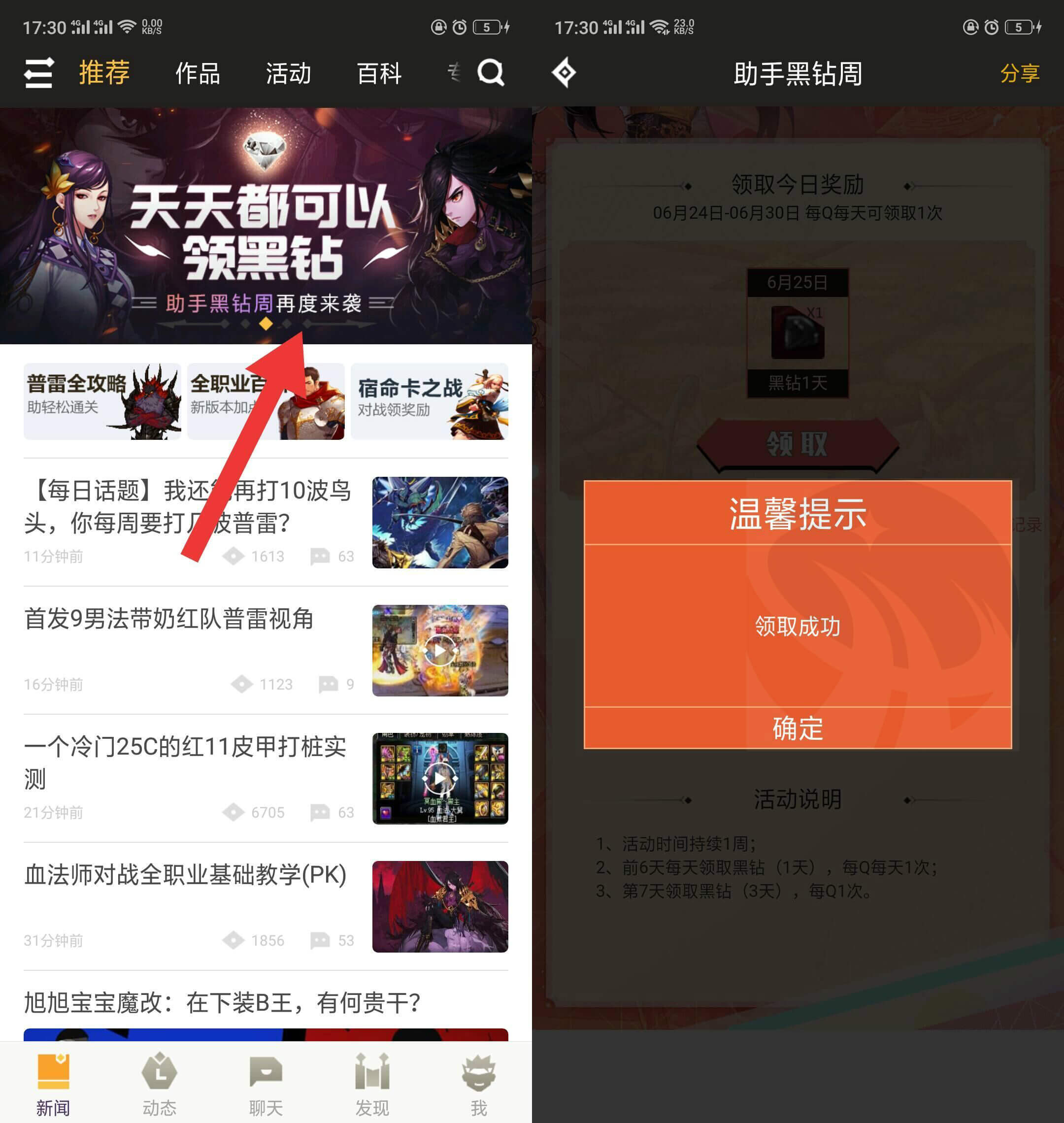 首页横幅如图所示->活动期间每天可领取1天黑钻共5天~